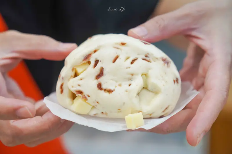 針對女性顧客、「蔓越莓優格乳酪饅頭」會是受歡迎的選擇。饅頭揉入了切碎的蔓越莓、還加入了明顯的乳酪丁。乳酪丁的口感帶有點酸甜、加上蔓越莓本身的果香和酸甜、整個用料很實在。