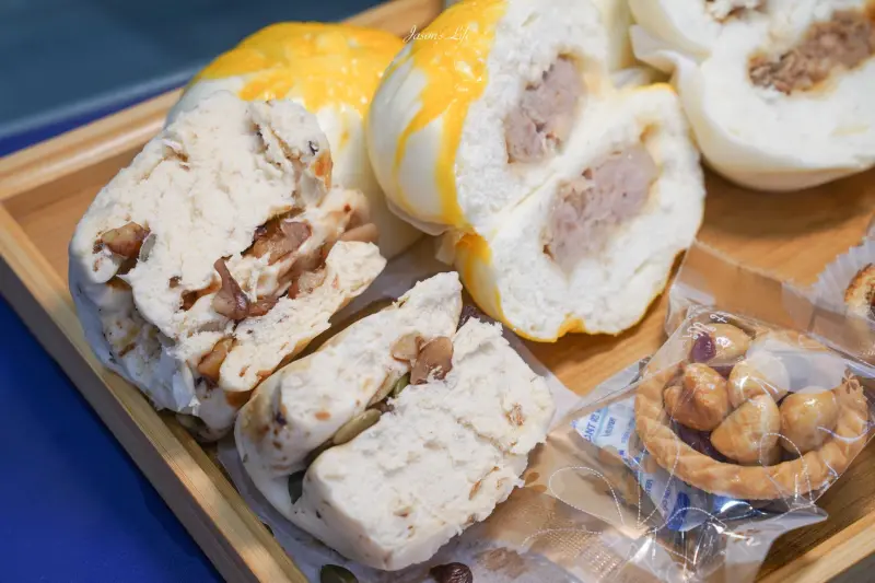阿潘肉包也兼顧養生與甜點市場。例如「堅果核桃饅頭」的麵糰使用小麥粉和黑糖、再加入核桃、南瓜子、亞麻子擀製而成。饅頭一扒開、可以看到滿滿的堅果在其中。每一口除了Q彈帶點甜味的饅頭以外、多了脆脆的口感、吃起來也滿有飽足感。