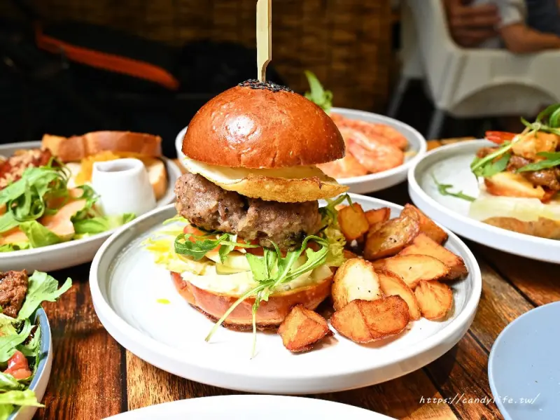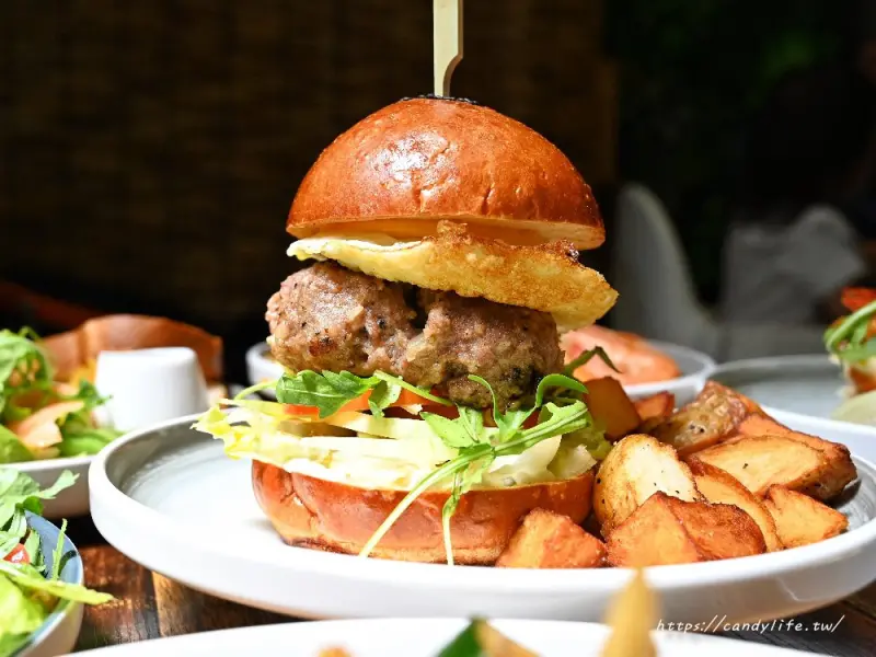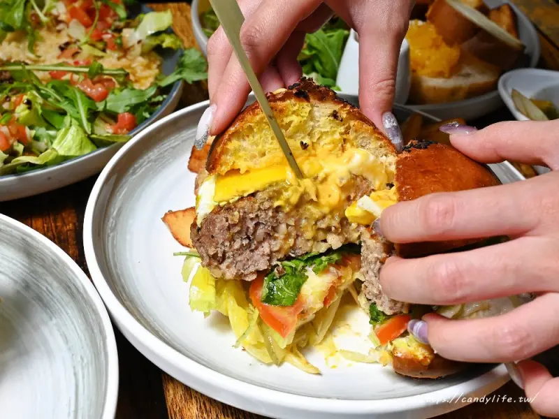 堆高高看起來超氣派的美式漢堡也是人氣招牌,採用牛背肩、牛胸腹製成絞肉,加上蒜頭、洋蔥、花椒油打成的漢堡肉,足足有200g,且牛肉排的熟度是可以調整的