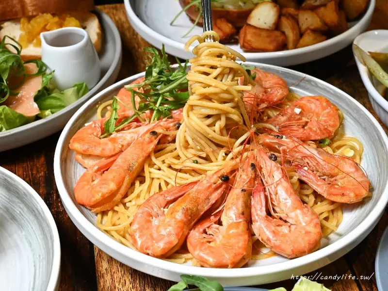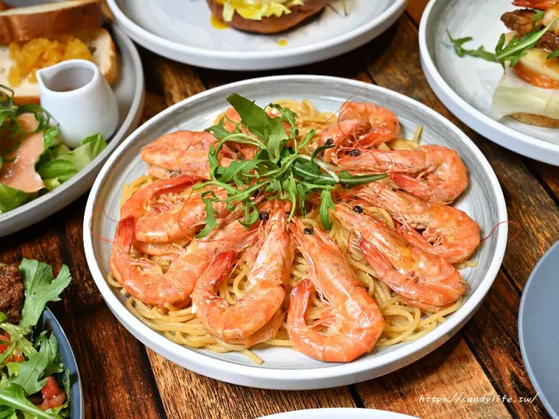一上桌就被那霸氣十足的鮮蝦給吸引住啦!十隻鮮蝦直接撲滿在義大利麵上頭,醬汁採用蝦殼醬汁、奶油及鹹蛋炒製,還沒入口就香氣撲鼻