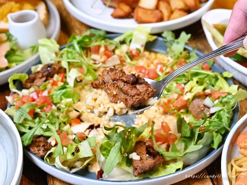 這道燉飯也很特別,牛肉的部分一樣採用紐西蘭菲力,加入希臘優格下去醃製,加上摩洛哥香料,搭配蘿蔓、綠捲、芝麻葉、蕃茄,再加入辣椒水點綴