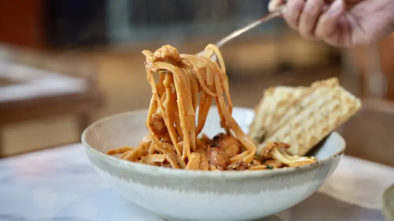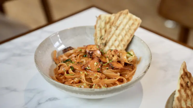 除了胡姆斯,「吐司利亞」林口店還推出了多款獨家限定的主餐,讓熟客們也充滿新鮮感,「火烤章魚白花椰義大利麵」將Q彈的章魚腳經過火烤,帶出迷人的炭燒香氣,搭配清甜的白花椰菜與彈牙的義大利麵,地中海風味十足,而「炸魚柳薯條」則是大人小孩都無法抗拒的美味,魚柳外酥內嫩,每一口都吃得到魚肉的鮮甜,這些只有在林口才嚐得到的限定美味,也讓這家分店更具吸引力。