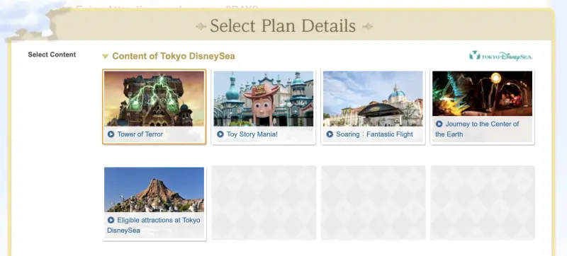 - 另外一種 Eligible attractions at Tokyo Disneyland 或是 Eligible attractions at Tokyo DisneySea 則是有限定項目的快速通關券,不需事先預約,可以到園區內設施隨到隨用。