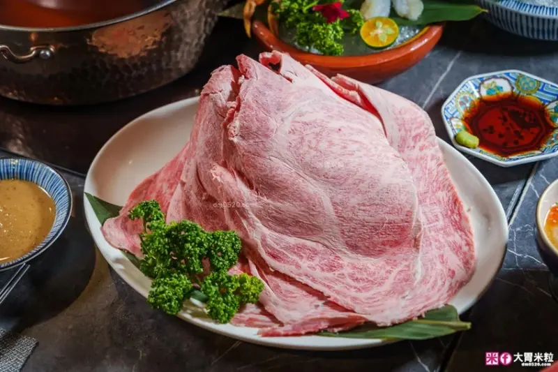 頂級和牛只需燙至變色約五分熟度即可!沾上桔醋醬和招牌胡麻醬,入口滿嘴奶油與堅果醬香,天啊~A5和牛真的超級好吃!