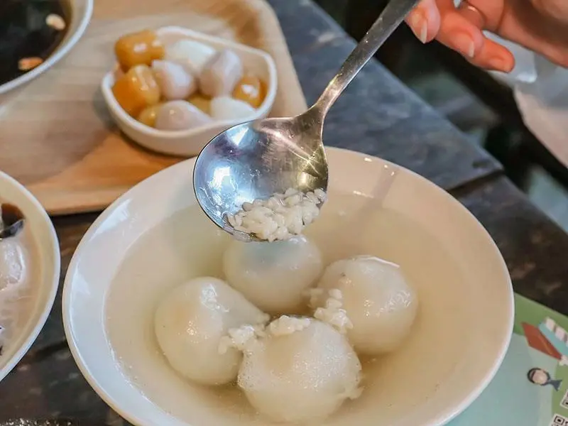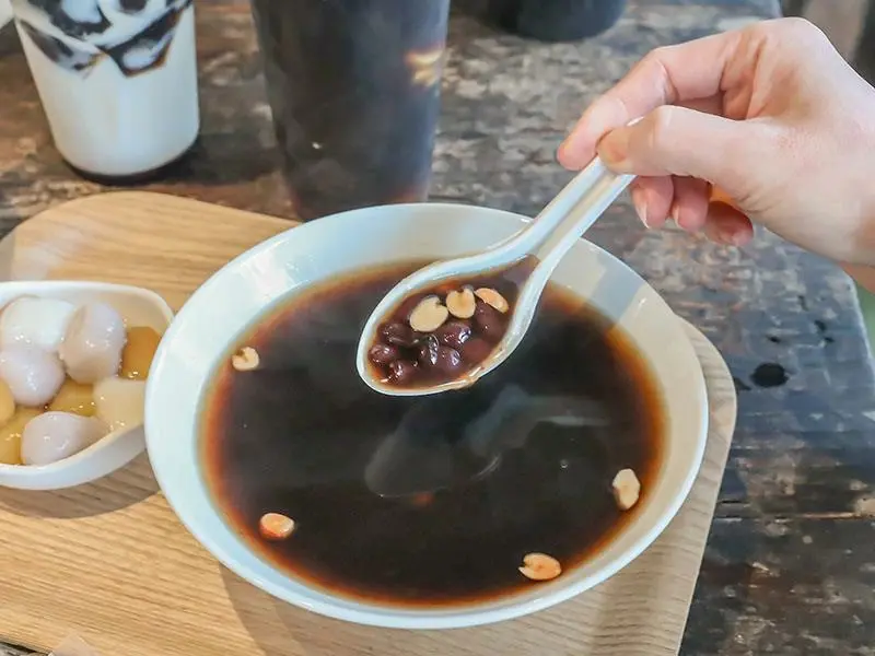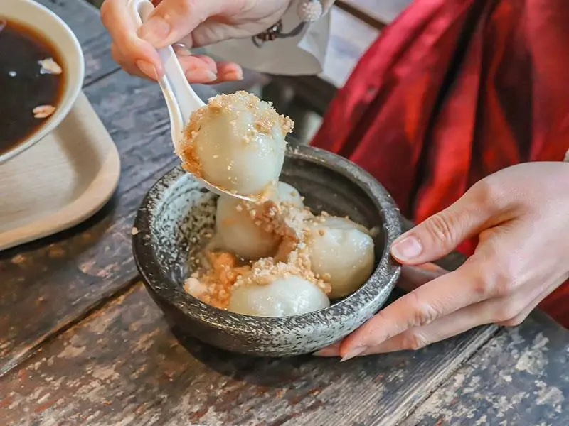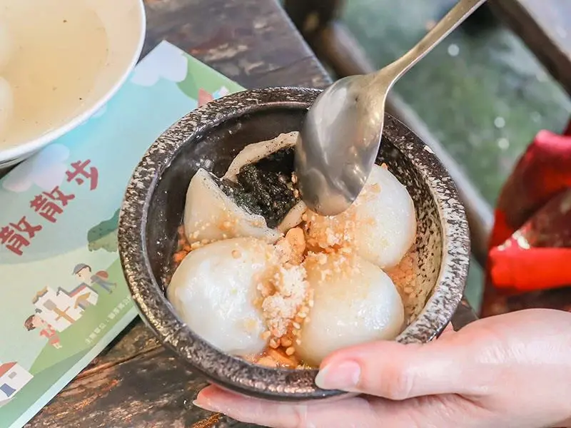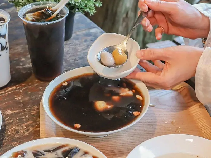 手工大湯圓是星仙草在冬日裡的靈魂美食。現場品嚐時,芝麻湯圓的香氣會隨著湯圓入口而化開,帶來溫暖又療癒的感受。店內也提供酒釀桂花湯圓(熱),定價80元。另一款暖心聖品是暖心燒仙草,定價85元。燒仙草以紅豆、花生作為基底,搭配手工製作的芋圓、地瓜圓、白玉等配料。濃郁熱燙的燒仙草,讓草本清香更為熱烈,是寒冷季節中最溫暖的選擇。此外,現場還有花生燒麻糬,定價90元,也是許多人喜愛的點心。