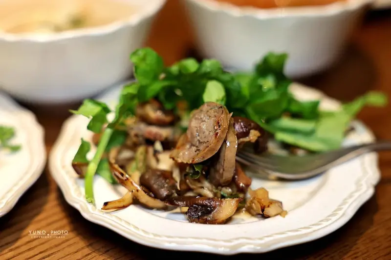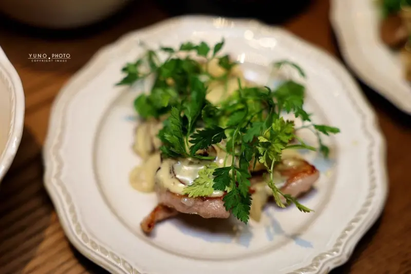 在主餐開始前,多樣化的湯品與小點為接下來的饗宴完美鋪墊。氣泡水配上清新的檸檬片,不僅能解渴,還能中和豐盛料理的濃郁味道。隨後送上的佛卡夏麵包佐海鹽奶油,佛卡夏散發著迷人的香氣,外皮微脆、內裡柔軟濕潤,搭配細緻的海鹽奶油,每一口都能感受到奶香與鹹味的完美融合。湯品方面,濃郁的培根馬鈴薯濃湯融合了馬鈴薯的綿密口感與培根的鹹香,入口滑順且溫暖。番茄蔬菜清湯則以濃郁的番茄基底融合新鮮蔬菜的自然甜味,酸甜適中,開胃又健康。開胃菜如椒香肉腸炒野菇,肉腸的椒香味與野菇的鮮甜香氣相得益彰。板煎豬里肌佐奶油蘑菇,豬里肌煎至金黃,保留肉質的鮮嫩與多汁,搭配香氣濃郁的奶油蘑菇醬,提升了料理的豐富層次。