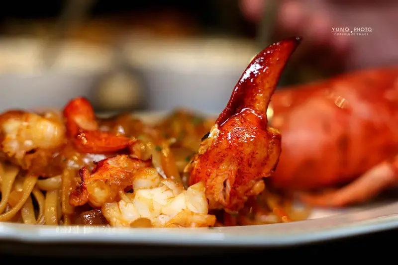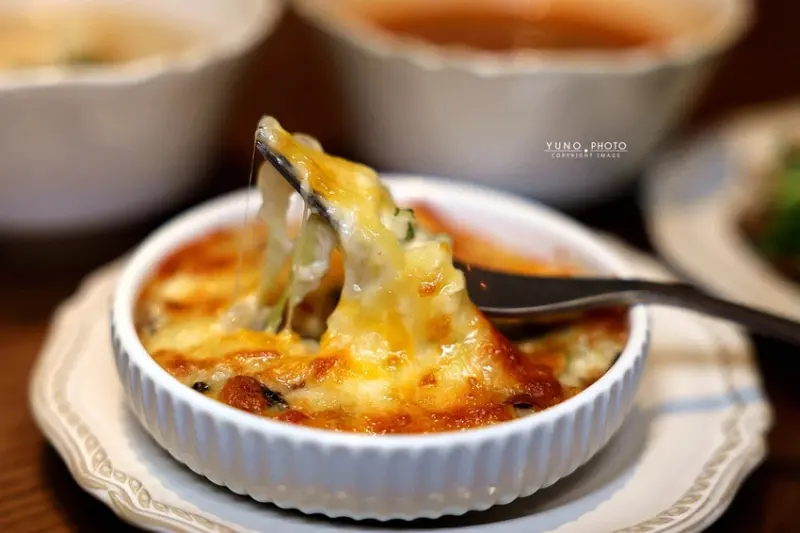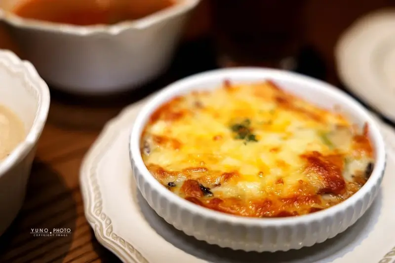 在主餐方面,招牌料理之一的波士頓龍蝦麵,將奢華的海鮮元素與義式料理完美結合。這道菜使用了新鮮的波士頓龍蝦,分量十足。義大利麵條採用了寬版細扁麵,能更充分吸附醬汁。醬汁是以濃郁的龍蝦湯底和香料調製而成,滲透麵條,帶有濃郁的海鮮鮮香與微微的辛香感。濃郁的醬汁完美包覆著彈牙的龍蝦肉,每一口都充滿了海洋的鮮甜滋味。此外,這裡的燉飯也值得一試,例如奶油培根野菇燉飯,米粒煮得恰到好處,帶有微微的咬感,吸滿濃厚的奶油醬汁,香氣四溢。另一道奶油野菇奶油焗白菜,則以新鮮野菇與白菜為基底,搭配濃郁奶油白醬和起司,外層金黃酥脆,口感層次分明。