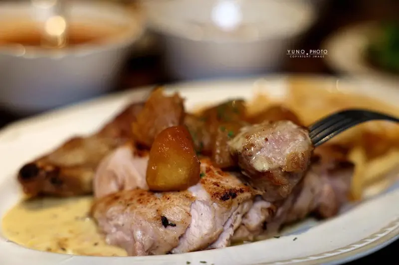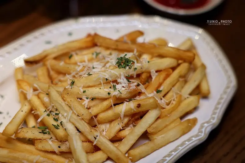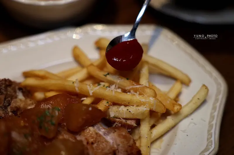 對於肉食愛好者來說,這裡的主打菜不會讓人失望。精選美國牛肉製作的美國CH帶骨牛小排,份量驚人,重達32盎司。牛小排烹調得相當軟嫩,搭配香濃醬汁與炸過的蒜片,增添了濃郁的香氣與口感。這道豪華料理非常適合多人分享,既能感受牛肉的原汁原味,也能享受到醬汁的香濃口感。另外,噶瑪蘭戰斧豬排重達16盎司,厚實的豬排經過完美炙燒,外皮微焦,肉質鮮嫩而多汁,上層鋪滿蜜蘋果,自然的甜味與香氣,搭配濃郁的JK薯泥,為味蕾帶來層次分明的體驗。不論是牛小排還是戰斧豬排,都能搭配炸細薯條更有飽足感。炸細薯條外皮酥脆、內心鬆軟,灑上些許香草與帕瑪森起司碎,搭配番茄醬更好吃。