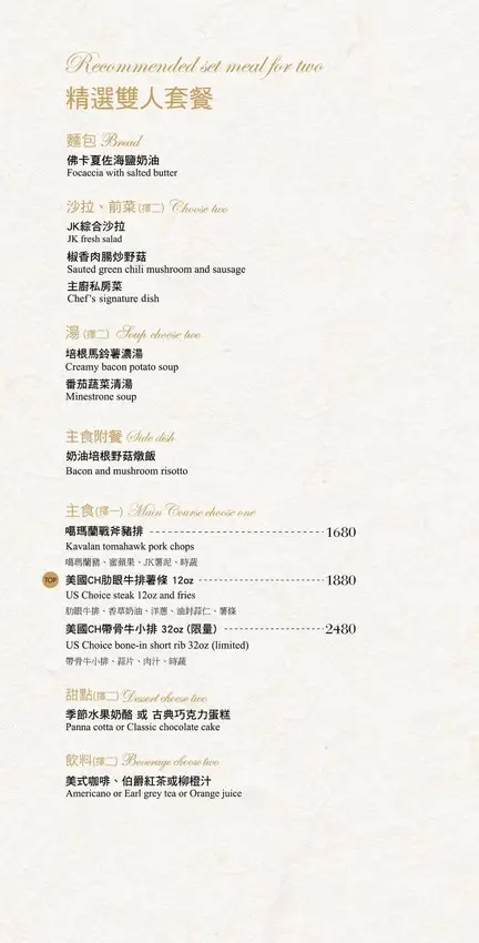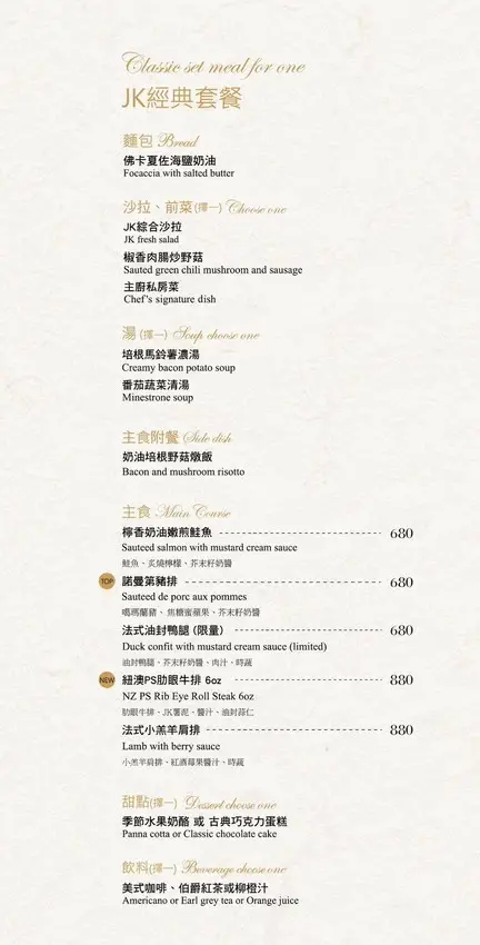 JK Studio歐陸餐廳的菜單結合了經典與創意,提供豐富多元的選擇。這裡的菜單也以豐富又實惠的經典套餐,贏得顧客的青睞。套餐內容十分完整,從麵包、沙拉、湯品到甜點與飲品,應有盡有。更令人驚喜的是,套餐甚至還額外附上一份濃郁香滑的燉飯,宛如雙主餐的概念,提供了極高的飽足感與滿足度。店家還首創了線上點餐與真人影印說菜服務,讓顧客可以清楚了解每道菜品的內容與特色。
