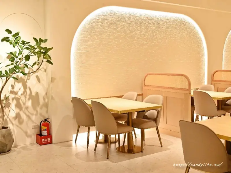 店內以簡約時尚風格為主,整體以柔和奶白色為主調,展現出乾淨俐落又不失溫度的氛圍,弧形牆面與間接光源設計,讓空間更具層次感與柔和線條,營造出輕盈而舒適的用餐環境