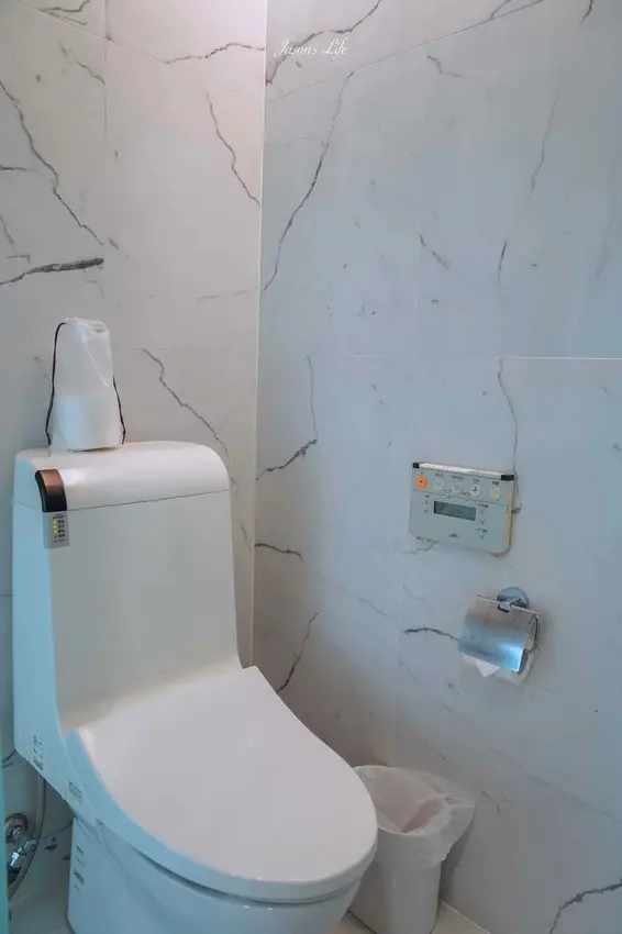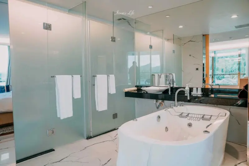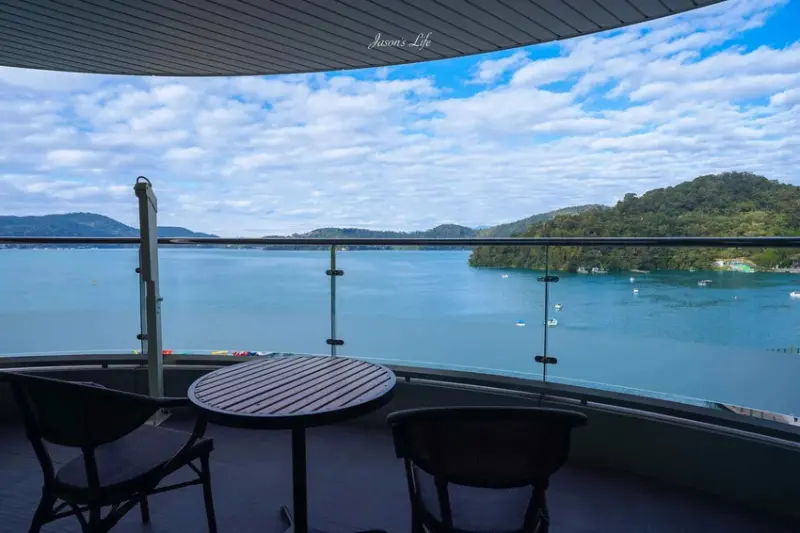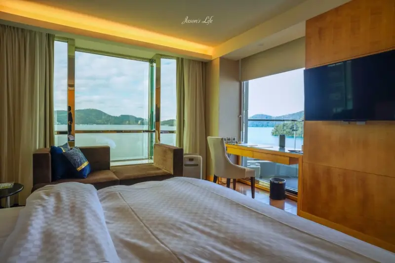 由於此房型位在邊間,因此擁有一塊非常大的圓弧形陽台,空間十分寬敞,看出去就是伊達邵親水步道,景觀非常好。天氣涼爽時,坐在陽台喝杯熱茶,十分愜意。房內貼心提供了膠囊式咖啡機及免費的迷你吧。浴室部分採開放式設計,可以邊泡澡邊看湖景,如果覺得害臊,兩邊也有設計拉門,拉起就是一個獨立的衛浴空間。浴缸還是搭載按摩浴缸,搭配櫃檯提供的浴鹽,讓旅客能徹底放鬆。此外,衛浴空間採乾濕分離設計,並使用了TOTO免治馬桶,吹風機則是提供了知名的Dyson吹風機。