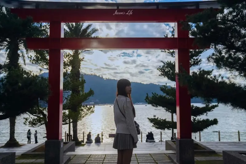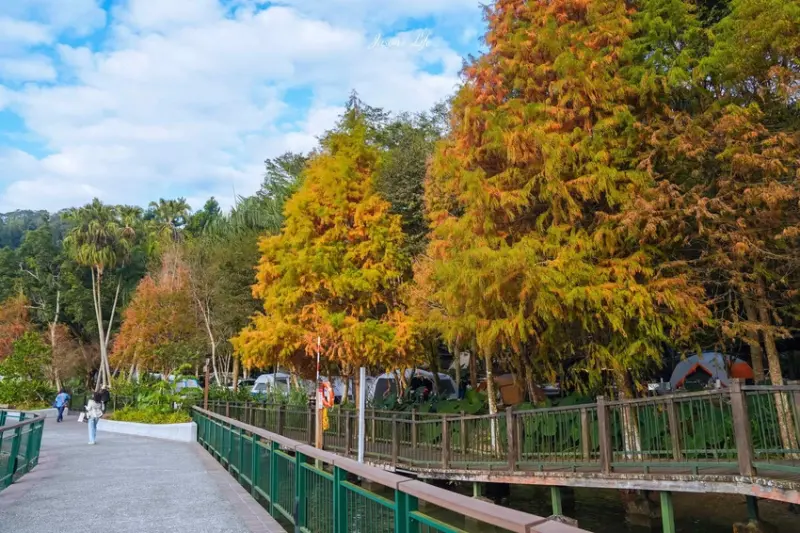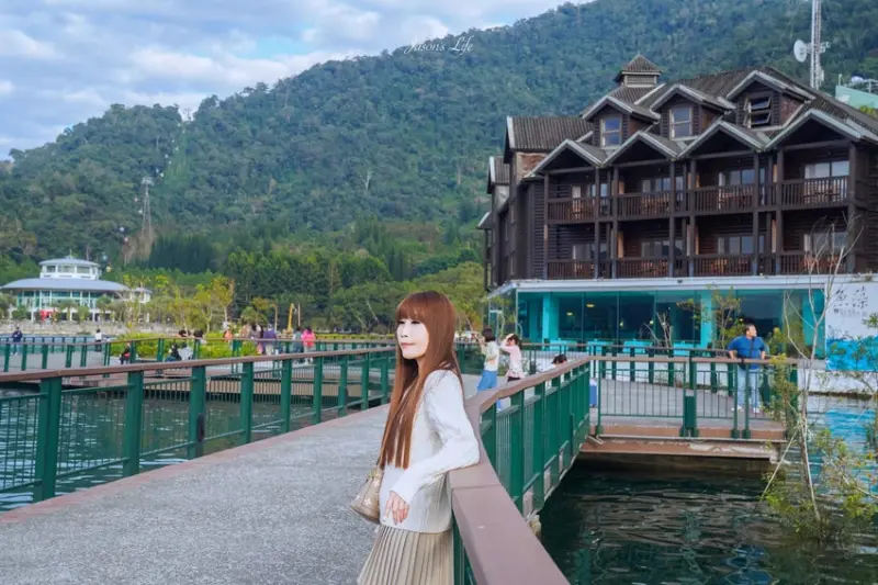 晶澤會館往右走就可以沿著伊達邵親水步道散步到日月潭纜車站。沿路的風景很美,特別是遇到木造房屋當作背景時,景色就像在國外一樣。正值落羽松季節時,還可以欣賞到落羽松漸層的美景。日月潭纜車站有個鳥居可以拍照,也可以搭乘纜車往返九族文化村。附近景點還包括向山遊客中心,在落羽松變紅時,搭配日月潭湖光山色,吸引大批遊客朝聖。