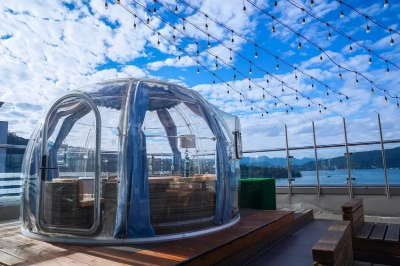 飯店的十樓屋頂設有一個景觀台,夜晚高掛的燈泡亮起時,景色十分浪漫。這裡設置了一個星空透明屋,是可以預約用餐的包廂,低消為3000元。如果是多人用餐,這空間還滿特別,但兩個人用餐可能在價格上就沒有這麼高的划算度。