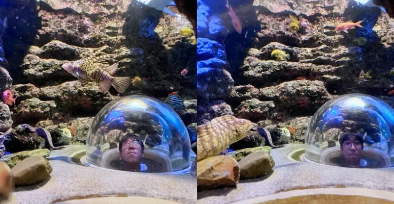 南館的展區設計是將日本到南極之間的水域分為5個部分,介紹生活在日本海洋、深海展廳、赤道海洋、澳大利亞海濱、南極海洋等不同地區的海洋環境及物種樣貌。南館的特色之一就是黑潮大水槽的「沙丁魚龍捲風」。這個表演約5分鐘,但非常壯觀。超大群的沙丁魚隨著燈光和音樂變換隊形,時而往東、時而往西,讓人讚嘆大自然的神奇。即使錯過表演時間,看到一大群沙丁魚游來游去也相當過癮。