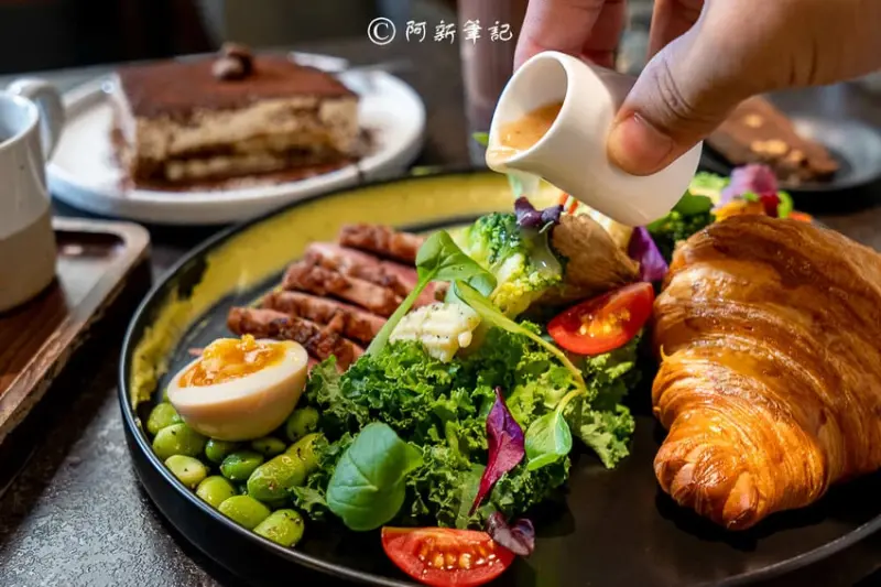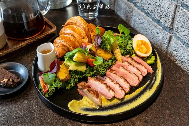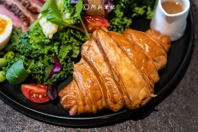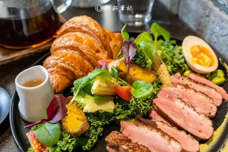 在《入厝咖啡》的早午餐時段,「舒肥脆皮鴨胸佐自製檸檬酪梨醬」是眾人推薦的必點主打之一。這道餐點擺盤配色非常漂亮,份量十足,即便作為早午餐也能讓顧客飽到直接跳過下午茶。舒肥脆皮鴨胸的口感完美符合名稱,鴨胸肉質嫩口,讓人愛不釋手。在咀嚼間,能感受到鴨皮帶有的脆口口感與焦香味。如果搭配入厝咖啡特製的檸檬酪梨醬,滋味帶點酸度,更能刺激出沙拉蔬菜最天然的甜度,特別是玉米筍和地瓜。此外,《入厝咖啡》的可頌也超強,外層非常酥脆,咬下時會發出卡滋卡滋的碎裂聲,隨著咀嚼,香氣也會越來越濃郁。