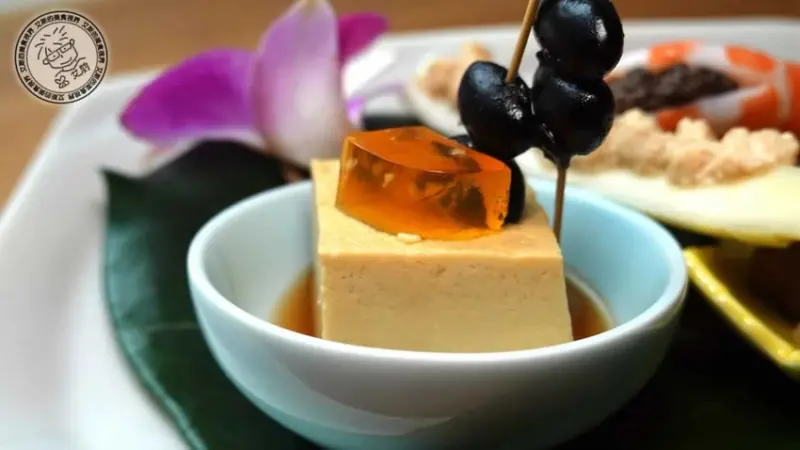 前菜:筊白筍豆腐沙拉+松露蝦+栗子蜜蓮藕+秋刀魚佃煮+胡麻豆腐