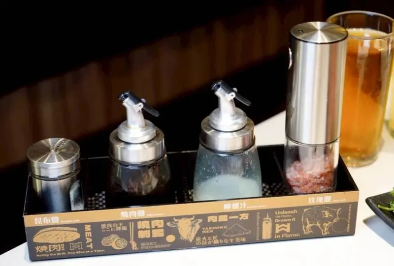 桌上都會提供昆布鹽、燒肉醬、檸檬汁以及玫瑰鹽。