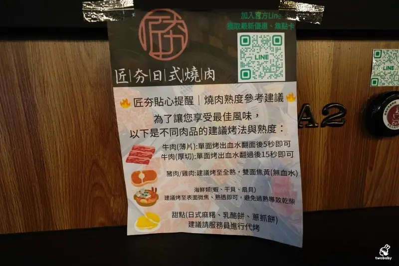 每個座位旁還有貼心提醒,不同的肉品有不同的燒肉熟度建議,才能品嘗到食材的最佳美味。