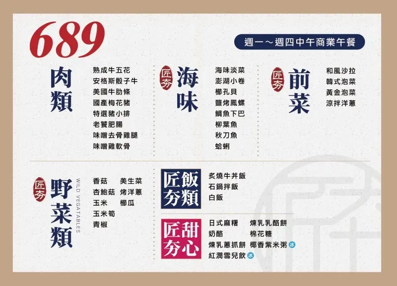 除了平日週一至週四限定的689的商業午餐,還有879元套餐、1089元套餐,或是想稿賞自己的 1289元、1357 元和牛套餐,