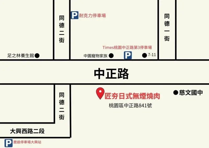 「匠夯日式無煙燒肉」位於 桃園市中正路841號,地點非常好找,就在慈文國中附近,