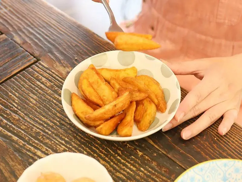 厚切、外酥內鬆的薯塊,吃得到天然香氣,保留馬鈴薯皮口感更紮實。