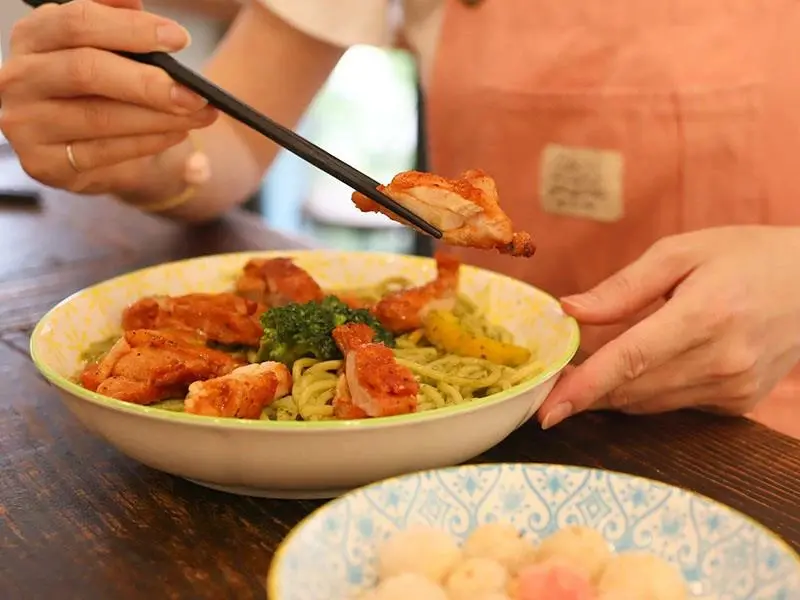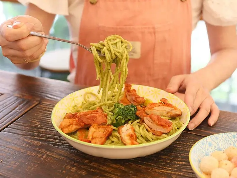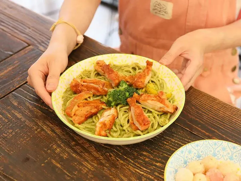 店家自熬的青醬口感清爽,醬汁依附在麵條上,羅勒香氣輕盈卻不單薄。匈牙利雞腿則有著淡淡辛香料味,肉質很嫩不柴,又是一個私心推薦!