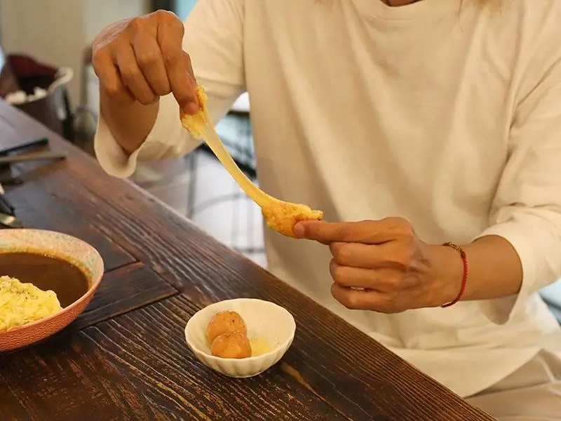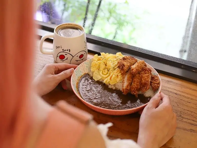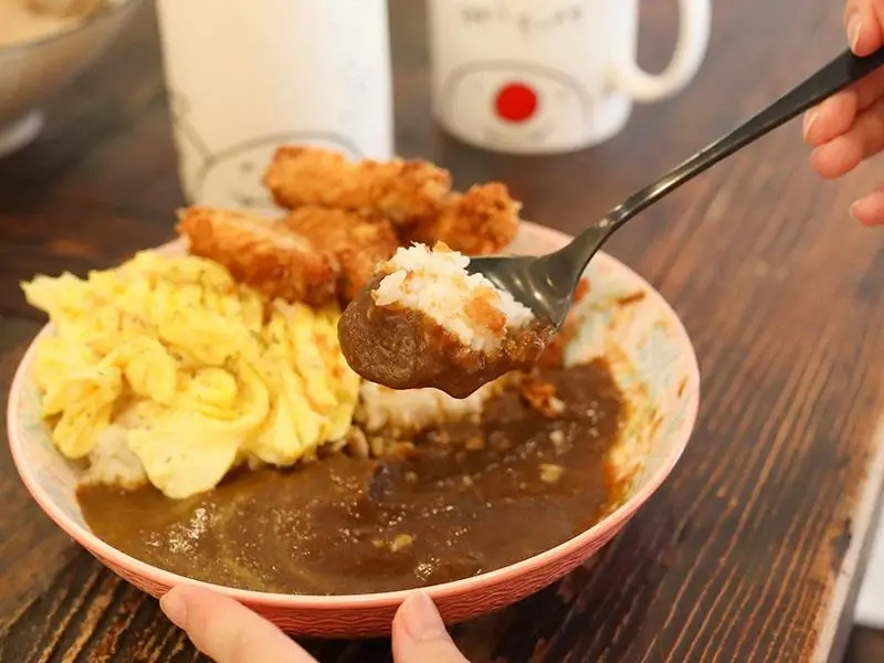 與日本好侍咖喱主廚共同研發的黑可可咖喱有著特殊果香,再加上一抹黑可可的香氣,熬煮出來的醬有香氣又有甜感之間的濃郁深色調。豬排外皮薄而酥脆,沾著咖哩咬下去還會發出酥脆的「咖滋」聲。