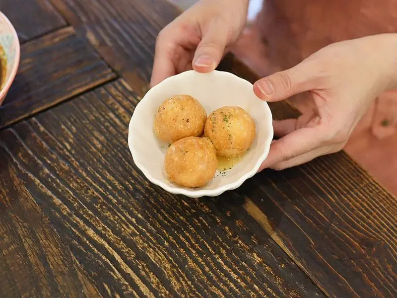 起司球淋上煉乳,外皮微脆,咬開後是拉絲的起司,是甜與鹹口味的小點心。