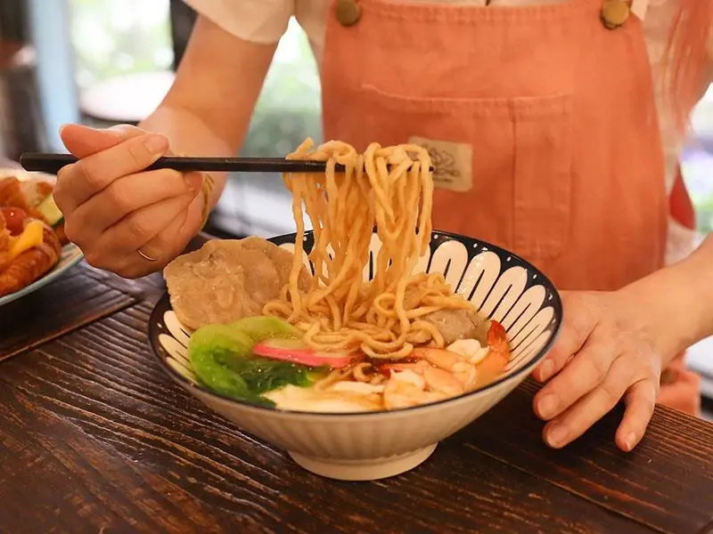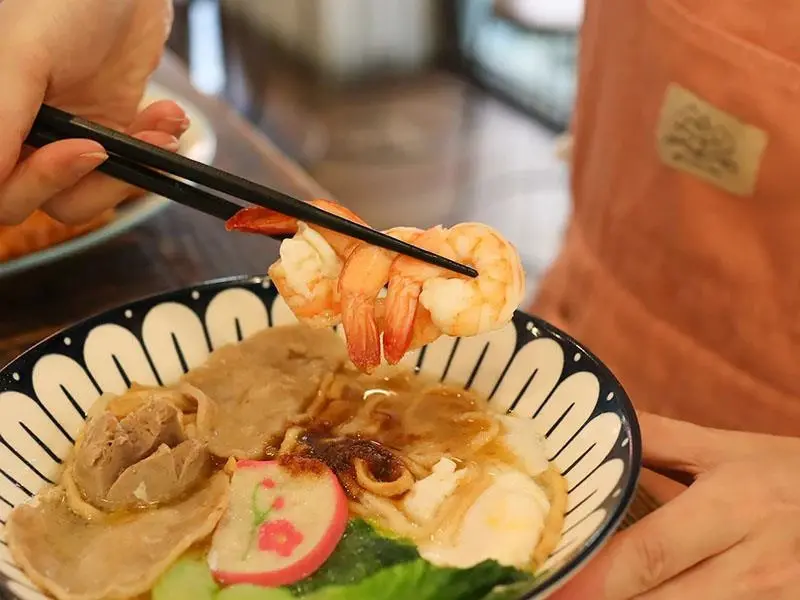 這一碗海陸鍋燒誠意十足!三隻蝦子加上兩片豬肉片,還有一顆新竹在地貢丸,湯頭是本體是清爽加上些許沙茶,Q彈的意麵飽足感拉滿,午餐時間吃這個很可以。