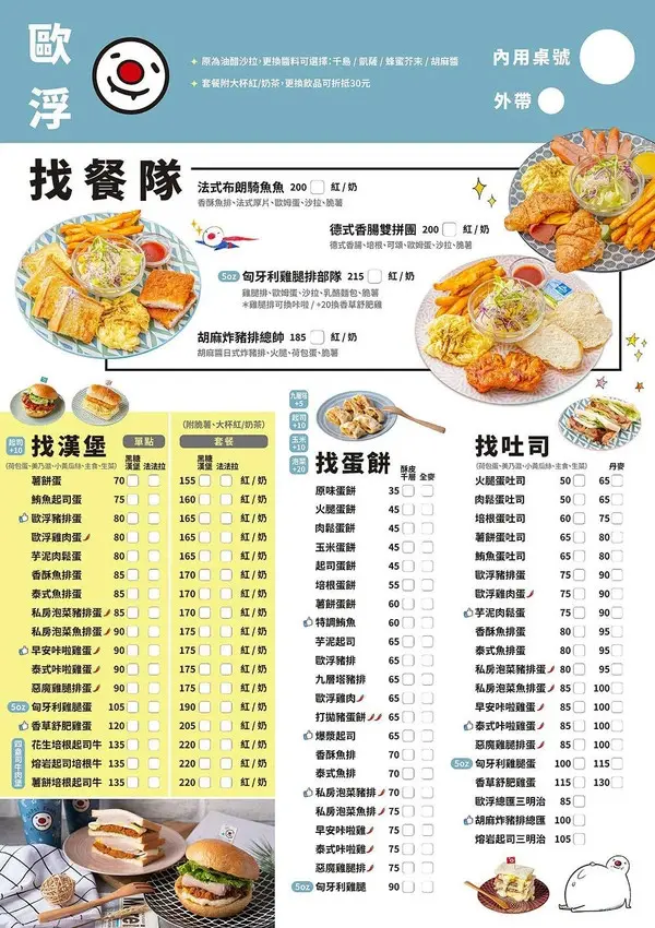 歐浮找餐不走華麗的早午餐風格,溫馨中帶的一點輕鬆自在,餐點用料紮實、份量不小氣、而且價格很有誠意,中、西料理都吃得到,想吃什麼直接來就對了!營業到中午三點,對於起床慢一點、午餐想吃飽一點的人來說,來歐浮找餐就對了。