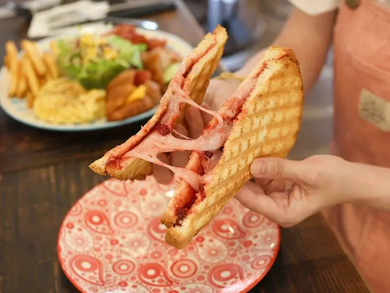 早午餐界的可愛代表,吐司烤德微焦酥脆,麻糬在熱度下變得牽絲又軟綿,草莓帶點酸氣,讓整體甜而不膩。