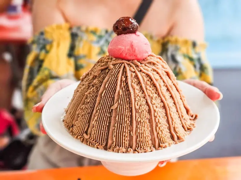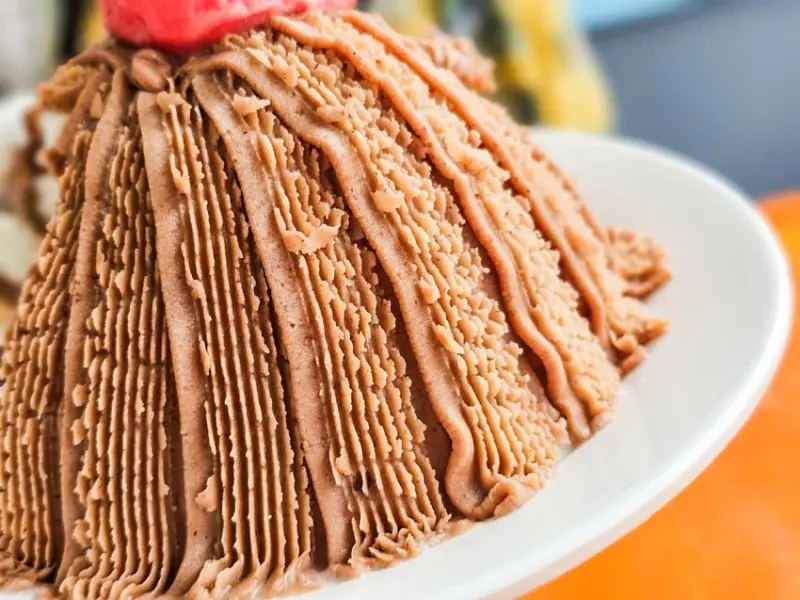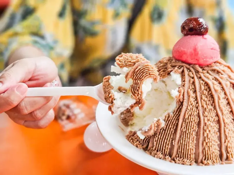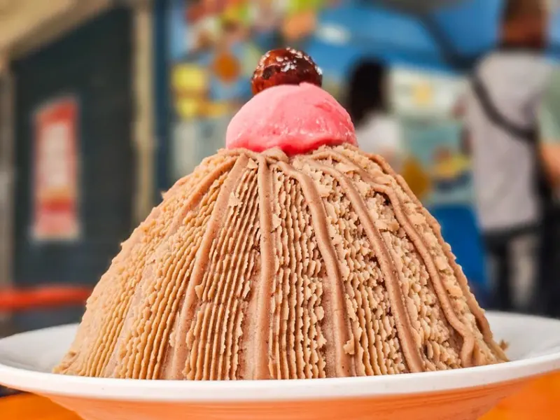栗子牛奶雪花冰,上桌簡直驚艷!跟我們印象中的雪花冰很不一樣,看起來很像一顆蛋糕,把雪花冰甜點化了吧,基底是牛奶雪花冰,然後在牛奶雪花冰的周圍擠花擠上滿滿的栗子泥,十足像是一個超大的蒙布朗,雪山頂上還放了一球蔓越莓綿綿冰