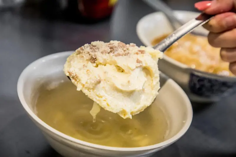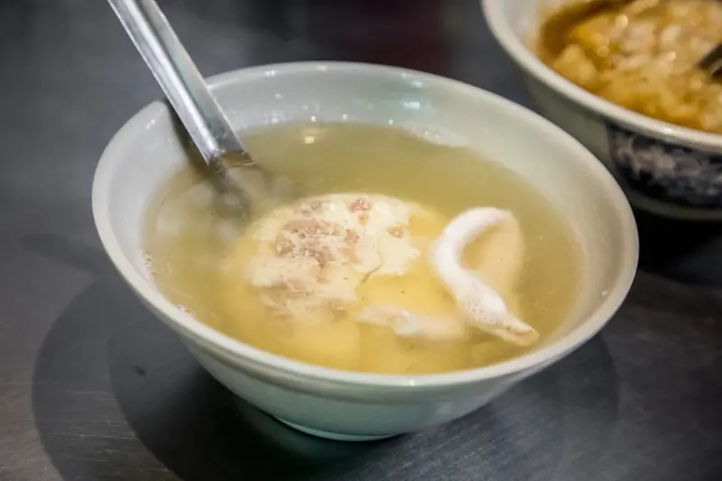 龍骨髓湯,是用每日進貨新鮮溫體豬脊髓,加上絞肉、青蔥,然後用日式蒸蛋的做法,龍骨髓吃起來沒有什麼腥味就是滑滑嫩嫩的,搭配蒸蛋一起吃口感更加滑嫩細緻,湯頭清甜又好喝,搭配肉圓剛剛好