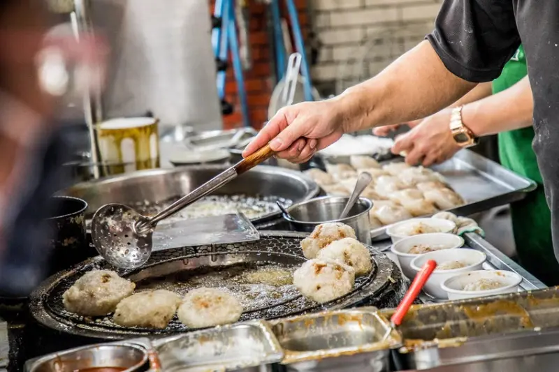 排隊的時候可以看老闆炸肉圓,阿三肉圓有兩個店面,一邊是做肉圓的工廠,排隊的地方是炸肉圓的地方,旁邊做好的肉圓會直接端過來炸,外皮炸到有點酥酥的樣子,就拿起來放在旁邊瀝油後淋佐料上桌