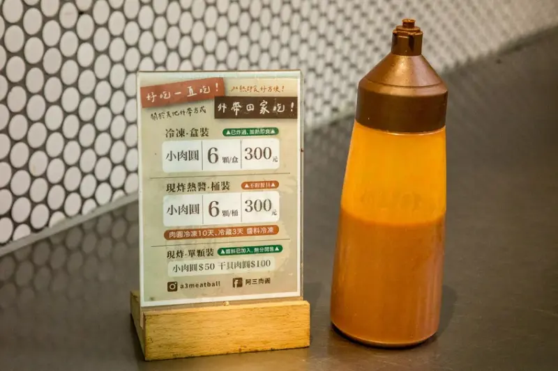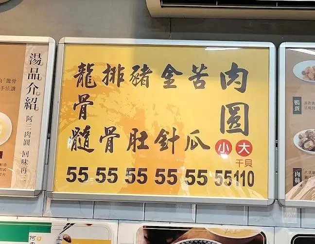 阿三肉圓賣的東西也很簡單,肉圓只有大、小兩種,另外還有五種湯品,9成的客人都是小肉圓+龍骨髓湯一組(已漲價小肉圓55元,干貝110元)