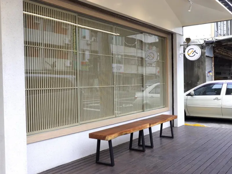 戶外騎樓有兩側木椅,