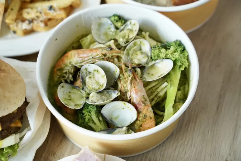 「經典海鮮青醬義大利麵」吃得到大顆蛤蜊、花枝及鮮蝦,起鍋後會再現刨帕馬森起司絲,青醬香氣混合海鮮的鮮甜,義大利麵口感也挺彈牙,就是不敗的經典口味。