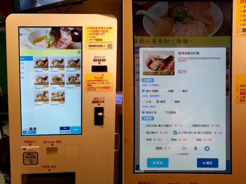 點餐跟「大角拉麵新竹店」一樣,採自助點餐機器點餐、結帳,真的超方便!麵條硬度、湯頭鹹淡、要不要蔥絲都能客製化調整。