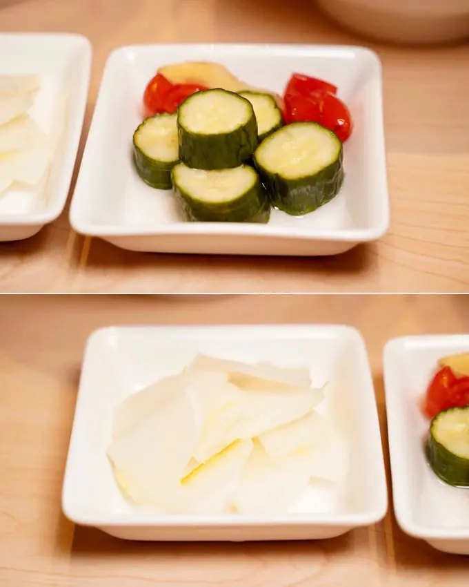小菜「梅子蕃茄小黃瓜」用費工的蛇腹切,吃起來不只更入味,口感也很棒。「柚子蘿蔔」也是相當清爽解膩。