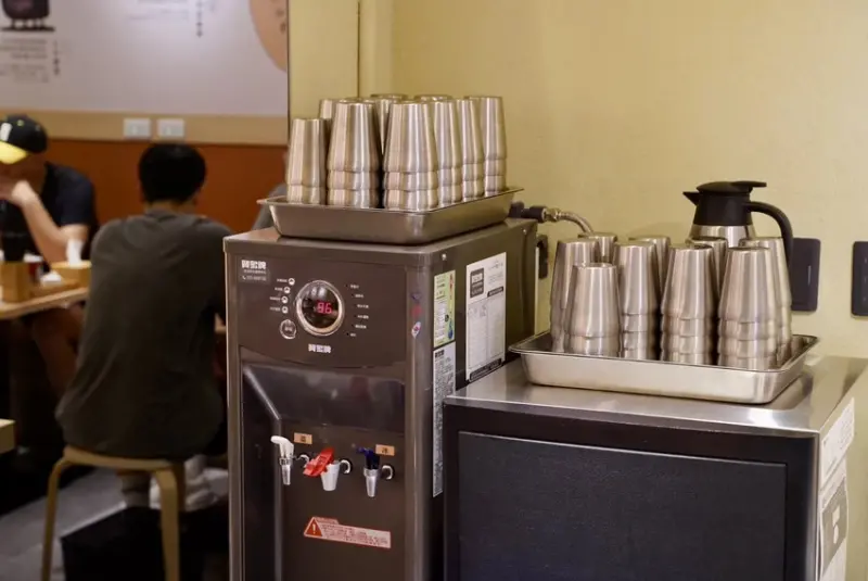 桌上調味料有蒜末、拉麵胡椒可以自行取用,想喝冰水也有飲水機可以自助使用。