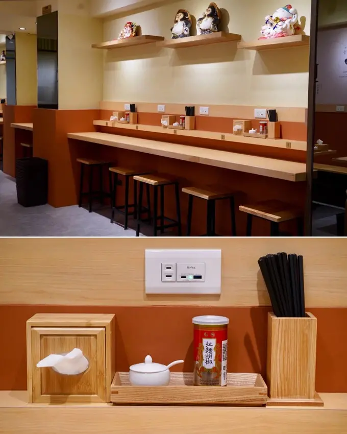內用區除了有單人吧台桌之外,也有四人座,很貼心的是有設置USB模組插座,像我那天手機快沒電,就能邊吃拉麵邊充電滑手機,這點真的超加分~
