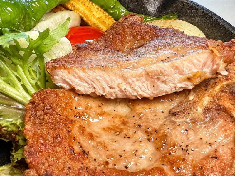 切開後可以看見有厚度的剖面,第一口的感覺是肉的嫩跟甜味,然後慢慢的會有微微的肉汁出來,中間的時候會吃到外層的脆度跟裡面的彈性,最後會有一點點的黑胡椒香。