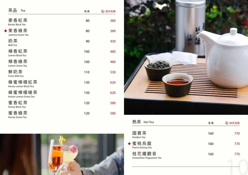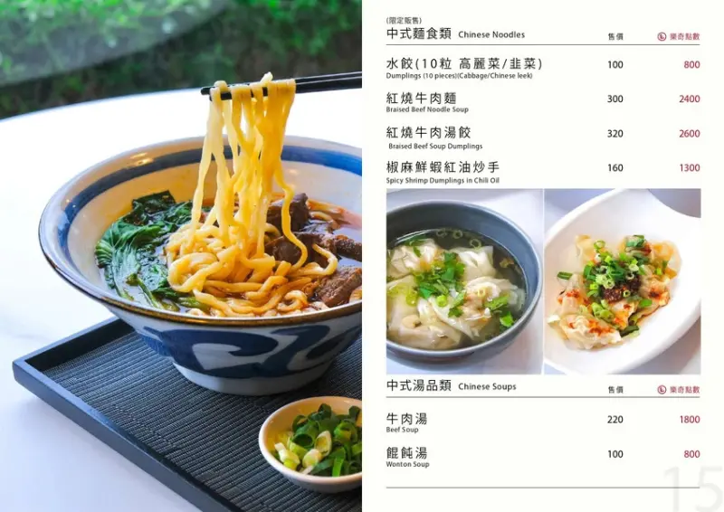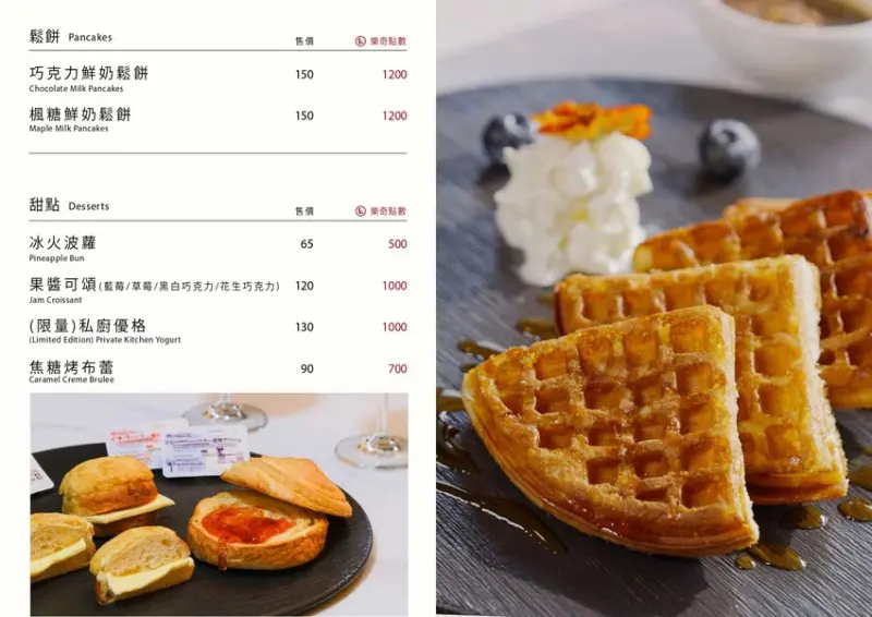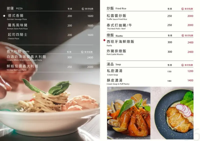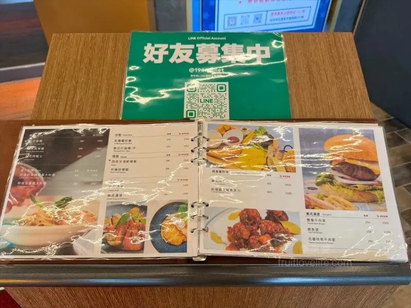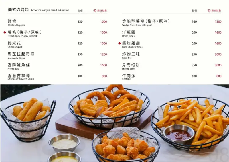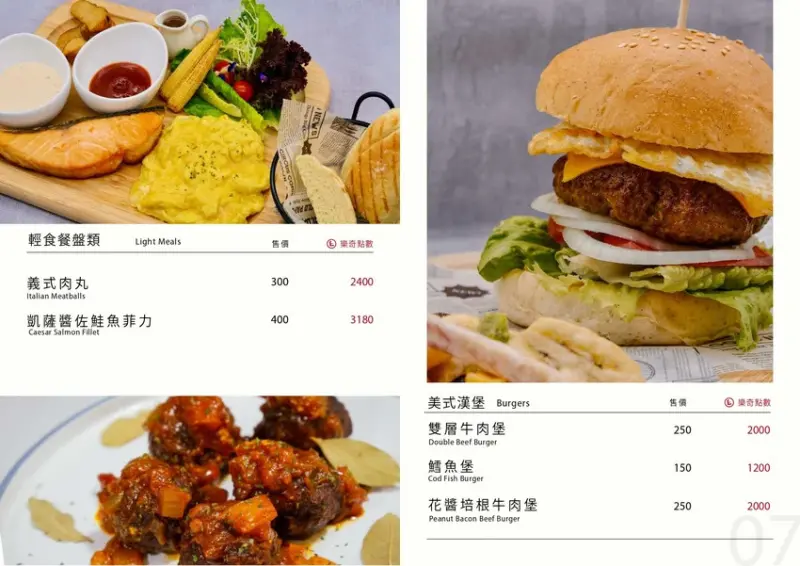 餐點全品項全天候供應、有輕食餐盤、美式漢堡、排餐、義大利麵、披薩、炒飯、燉飯、湯品、中式麵食、水餃、炒手、湯品、下酒菜、炸物、烤物、茶品、咖啡、甜點、果汁、氣泡飲、牛奶⋯等。