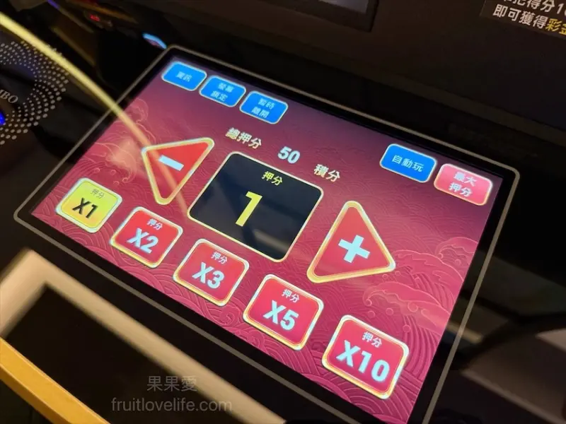 螢幕上有遊戲內押分與實際票分的倍數比可以選擇,黃色的小數字是實際的票分,白色則是遊戲內的虛擬押分,嗯~以一個不碰遊戲的我可以理解到這裡,已經幫自己拍拍手了。