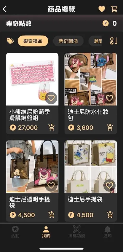 樂奇APP上面可以看到樂奇點數和兌換的禮品,不定期也會做更新,有吃的、有喝的,也有麗寶住宿卷跟禮品。