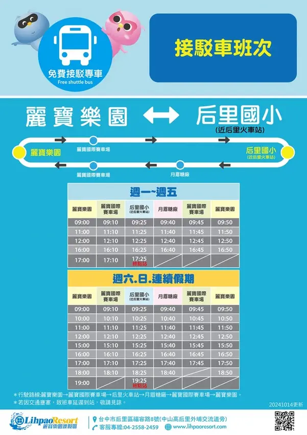在桌子上有看到接駁車的班次,周一到周日都有,有需要的朋友可以參考上面的地點跟時間。有停對面麗寶員工停車場的朋友,離開時記得來這找警衛拿停車銀扣。