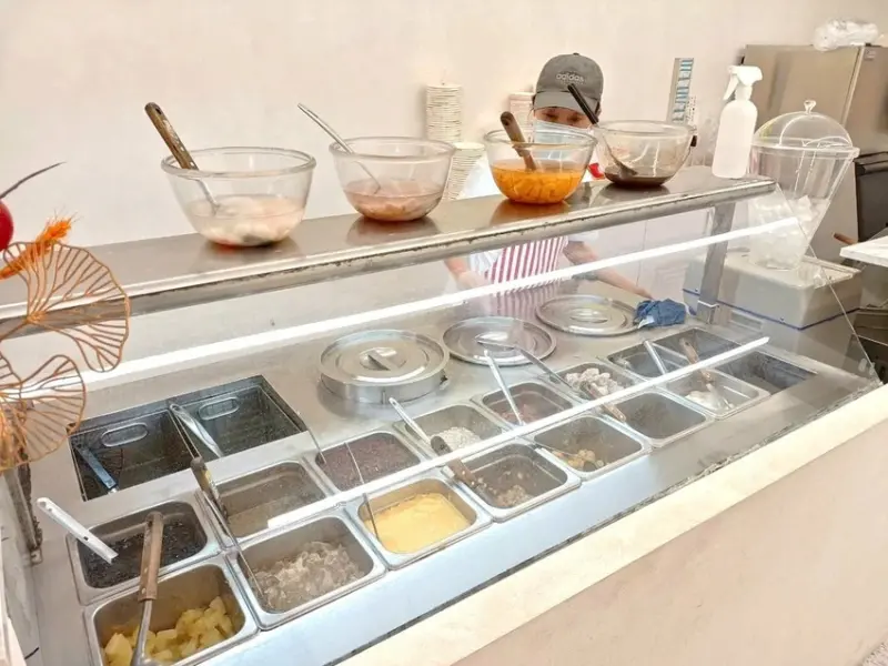 為了滿足不同顧客的需求,「以利泡泡冰」也隨著時代變遷,增加了更多樣化的產品線,如今的菜單上不只有近10種口味的泡泡冰,還提供了傳統刨冰、仙草、豆花等選項。店內的配料區更是琳瑯滿目,從經典的紅豆、綠豆到Q彈的粉圓、芋圓應有盡有,讓一家大小來到這裡,都能找到自己心儀的冰品組合,延續這份跨越世代的甜蜜滋味。
