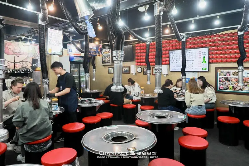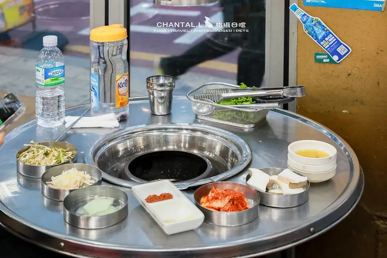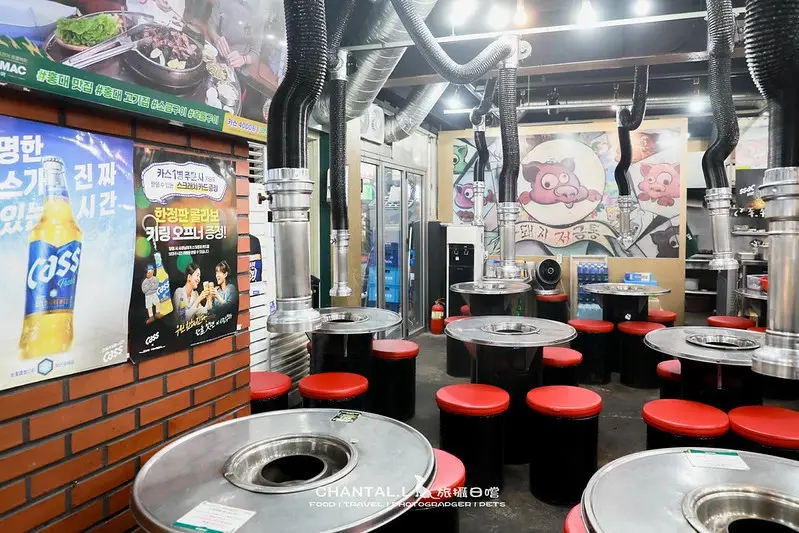 「수정옥돌생소금구이」的地理位置十分優越,就位在熱鬧的弘大徒步區內,距離地鐵站僅需步行幾分鐘即可抵達,店內裝潢是典型的韓式烤肉店風格,圓形鐵桌與可以掀開置物的鐵桶椅,空氣中瀰漫著烤肉的香氣與人們的歡笑聲,雖然環境稱不上精緻,卻充滿了在地生活的溫度感,讓人能徹底放鬆,享受大口吃肉的暢快。