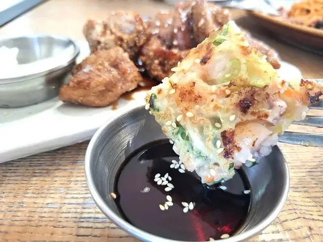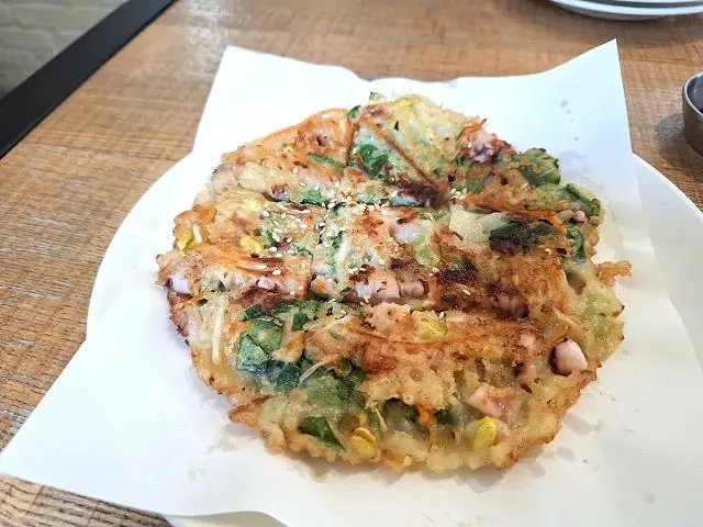 除了創意義大利麵之外,金孫韓廚也提供了經典的韓式料理。韓式炸雞採用去骨雞腿肉,外皮酥香,並均勻裹上一層甜辣醬汁。肉質鮮嫩多汁,絲毫不會乾柴。旁邊還貼心附上清爽的醃製白蘿蔔,酸甜脆口的風味,與炸雞的濃郁甜辣醬非常搭配,讓人一口炸雞一口蘿蔔,吃起來超級過癮,是極佳的解膩小幫手。海鮮煎餅也是不可錯過的經典菜色,金孫韓廚的煎餅厚實感十足,用料非常實在。煎餅內餡豐富,可以看到大塊的鮮蝦、魷魚以及高麗菜、紅蘿蔔等食材。煎餅外表煎到帶有焦香的薄脆感,但內層仍然保持著軟嫩Q彈的口感,搭配一旁的特製韓式醬油,讓海鮮的鮮甜更加分。