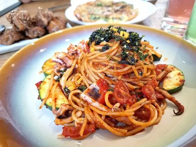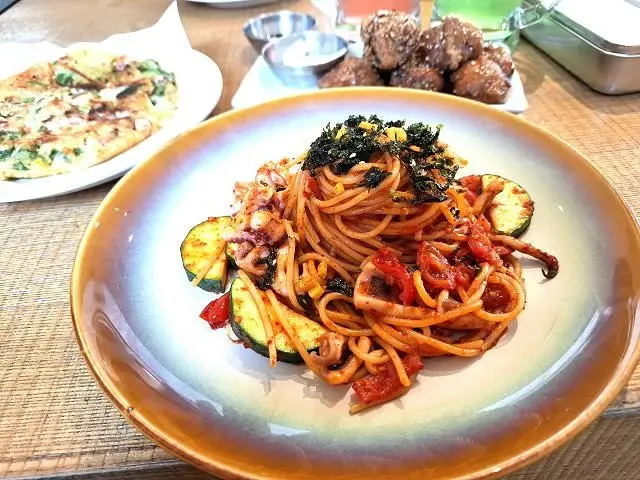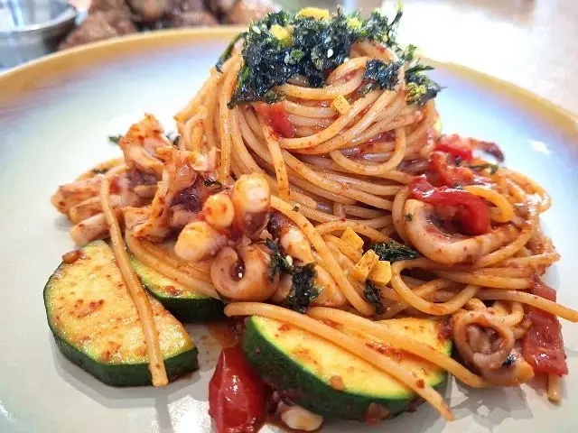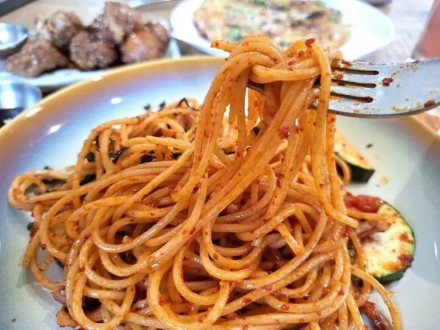 來到金孫韓廚,招牌的韓式義大利麵絕對是必點的品項,其中韓國辣醬魷魚義大利麵更是店內的明星商品。這道料理一上桌,立刻能聞到濃郁的韓式辣醬香氣,讓人食慾大開。辣醬的調味是整體美味的關鍵,它並不是死鹹或嗆辣的滋味,而是帶有甜度的微辣,層次豐富,讓人吃起來非常順口。主角魷魚處理得相當新鮮,口感彈牙脆口。義大利麵條本身略帶有嚼勁,能夠完美地吸附上滿滿的韓式辣醬精華。搭配爽脆的櫛瓜、番茄和海苔絲一同享用,讓整體的口感與美味度更加提升。